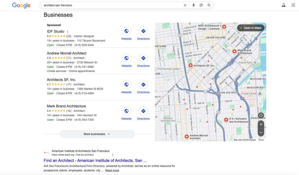 Local SEO for architects focuses on maximizing visibility in location-based searches and Google’s local map pack—the three listings appearing above organic results for local queries. Appearing in this coveted map pack generates significant qualified traffic and positions your firm as a top local choice.